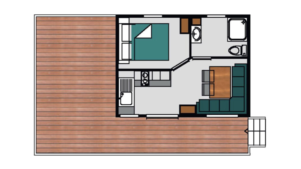 Le confort d’un mobile-home relooké en cabane de 20 m². Une chambre double avec 1 lit (160 x 200). Un coin repas convertible en lit 2 personnes (140 x 190). Une cuisine équipée. Une salle d’eau avec lavabo, douche et WC. Une terrasse en bois variant de 15 à 22 m² selon l’espace extérieur disponible car tous nos Faré sont différents. Un salon de jardin avec un parasol fixe en bruyère.