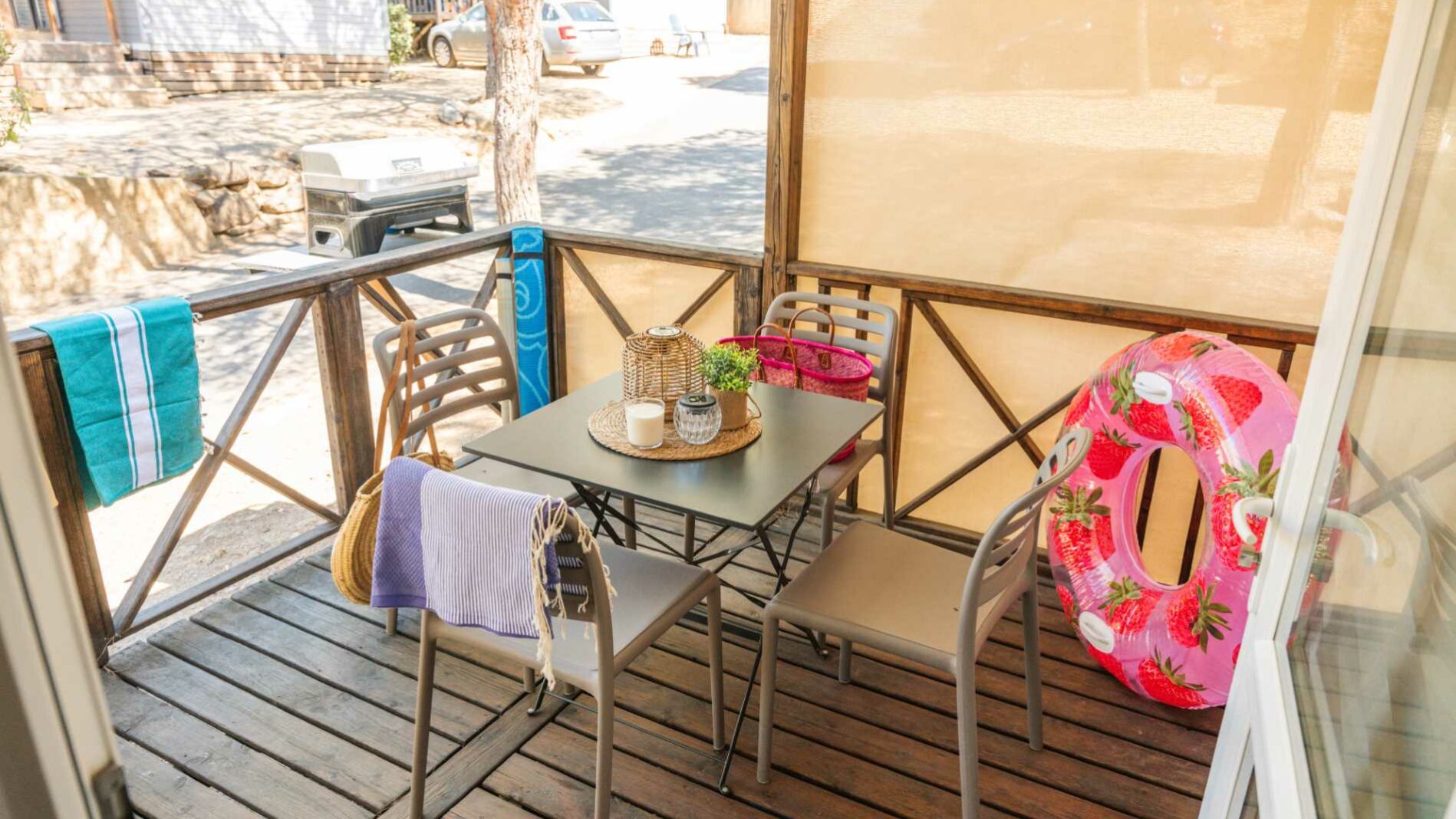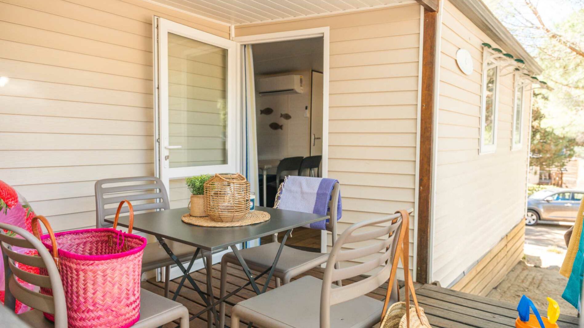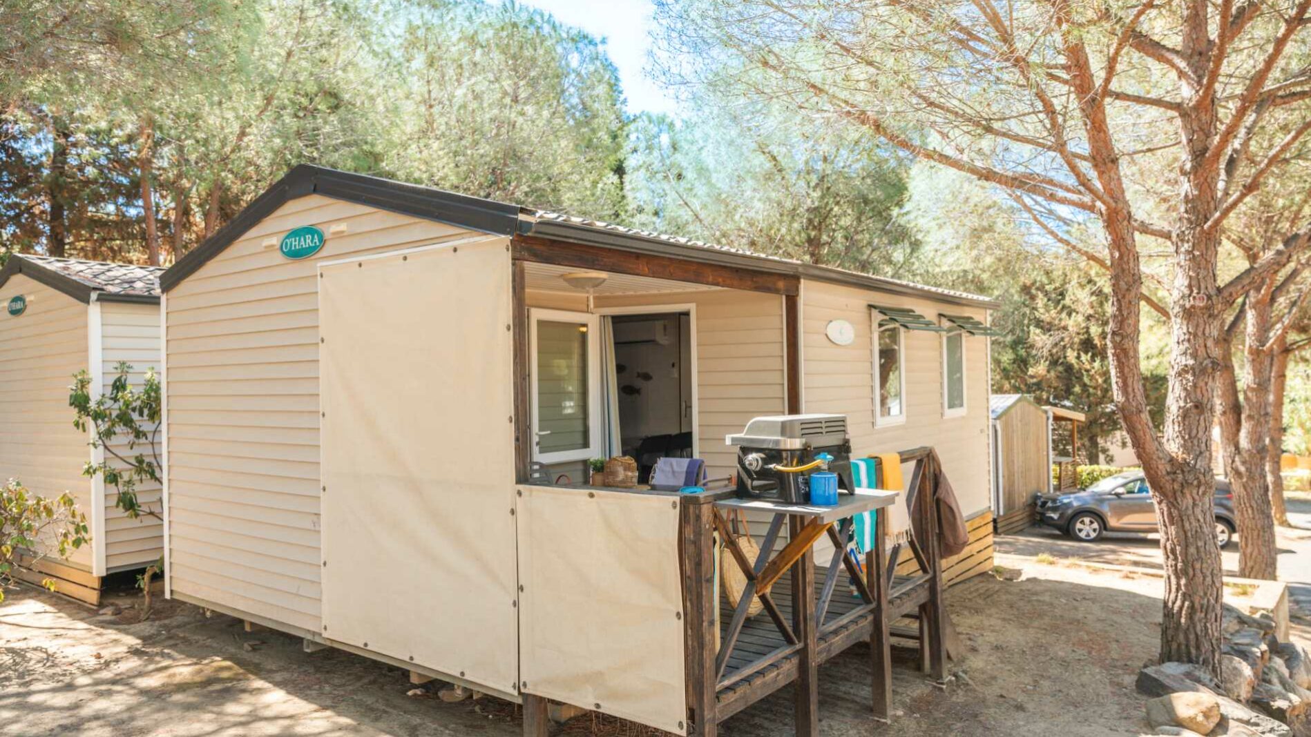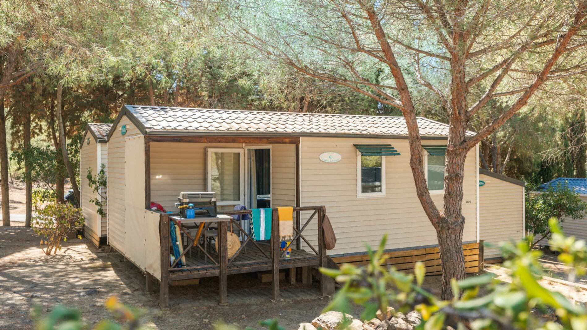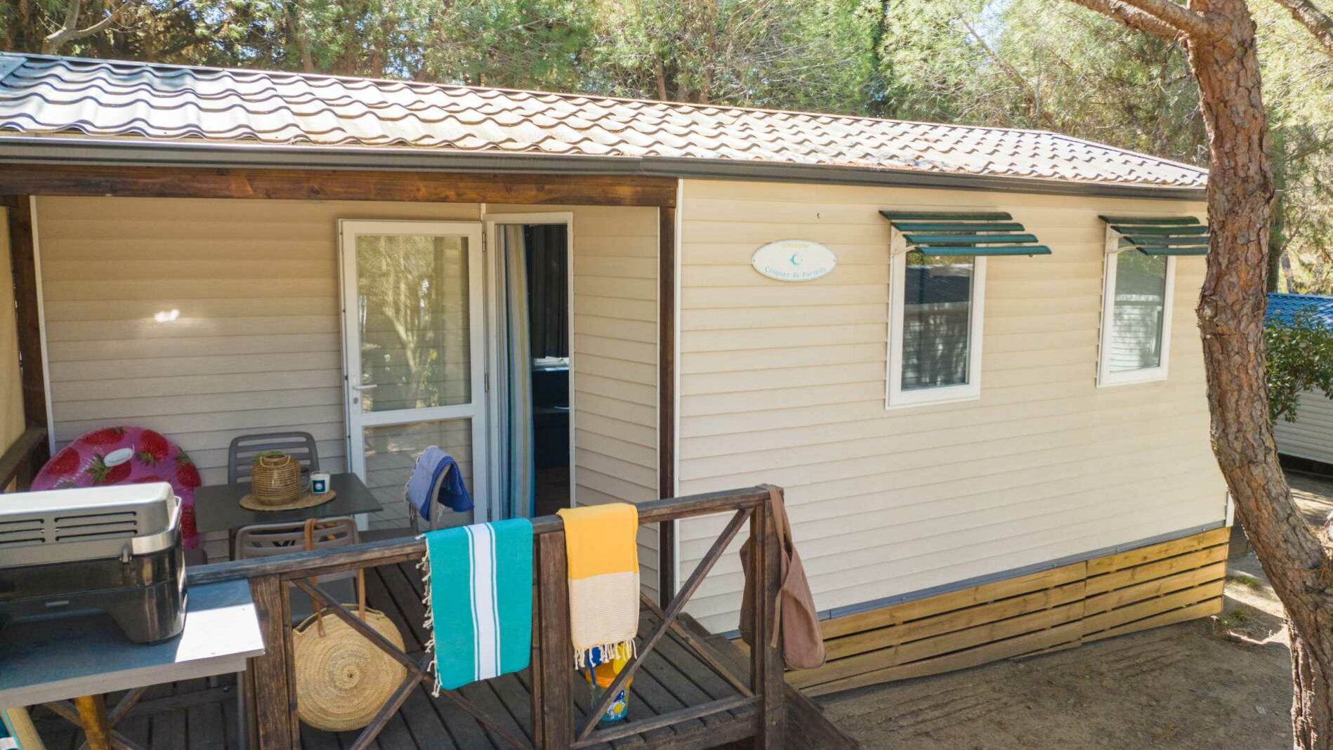 20 m² + 7 m² De terrasse couverte, une chambre avec lit double (160 x 200), une chambre avec 2 lits simples (80 x 190). Un coin repas convertible en lit 2 personnes (140 x 190). Une cuisine équipée. Une salle d’eau avec lavabo, douche et WC. Salon de jardin.