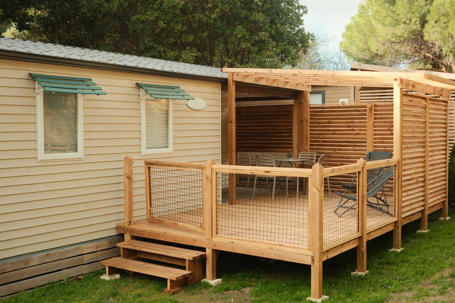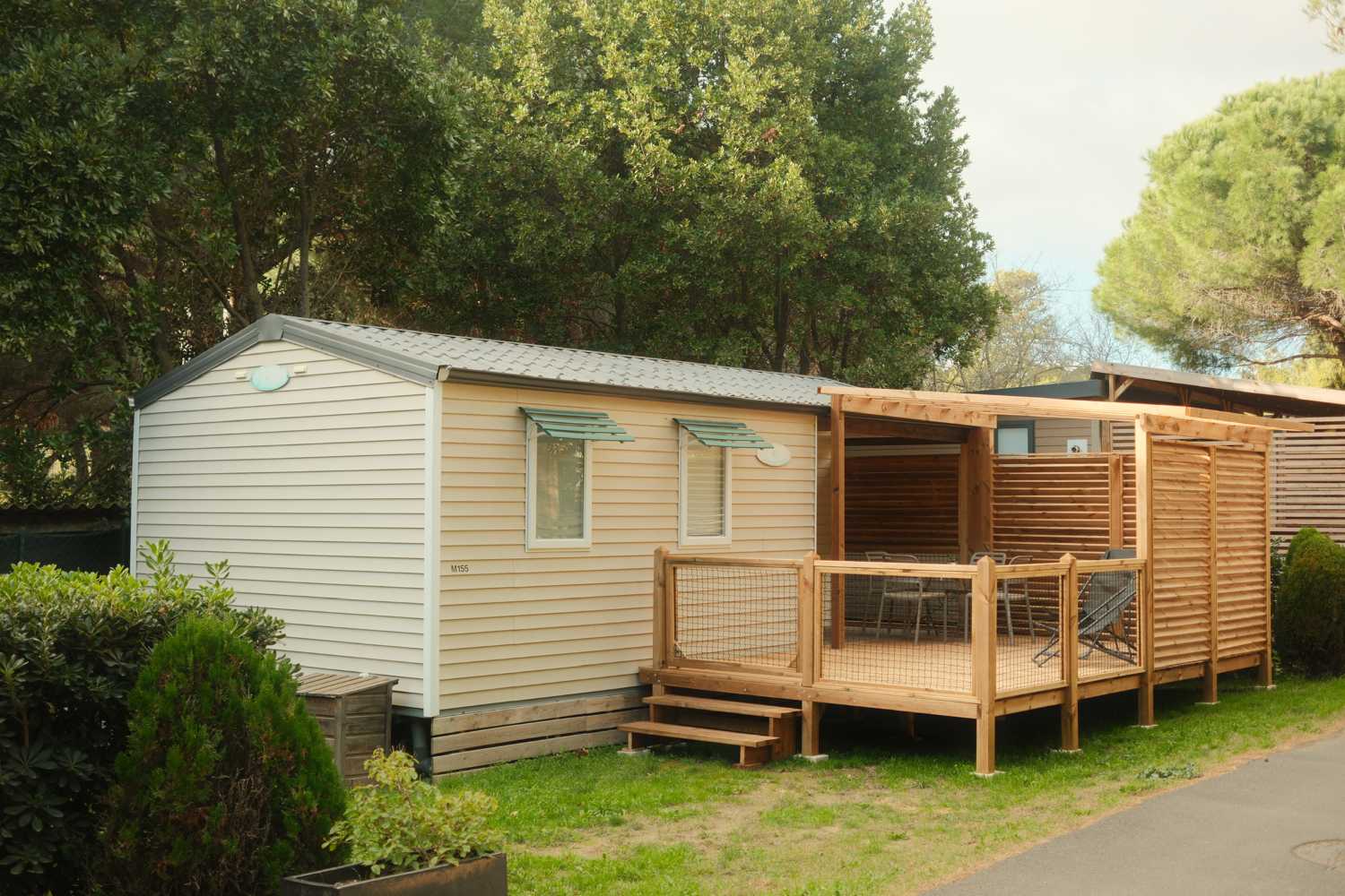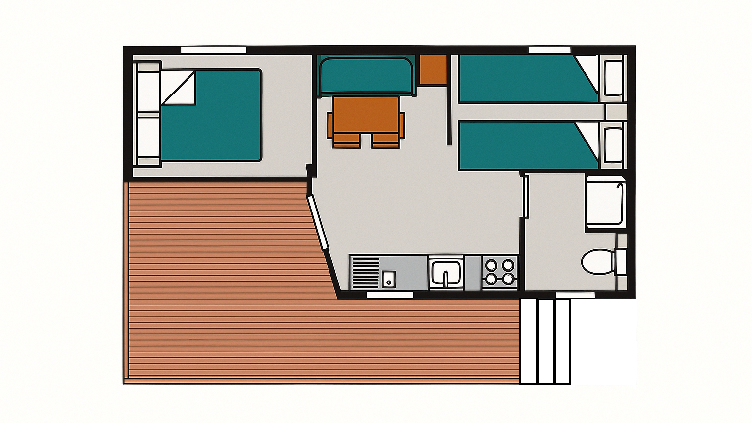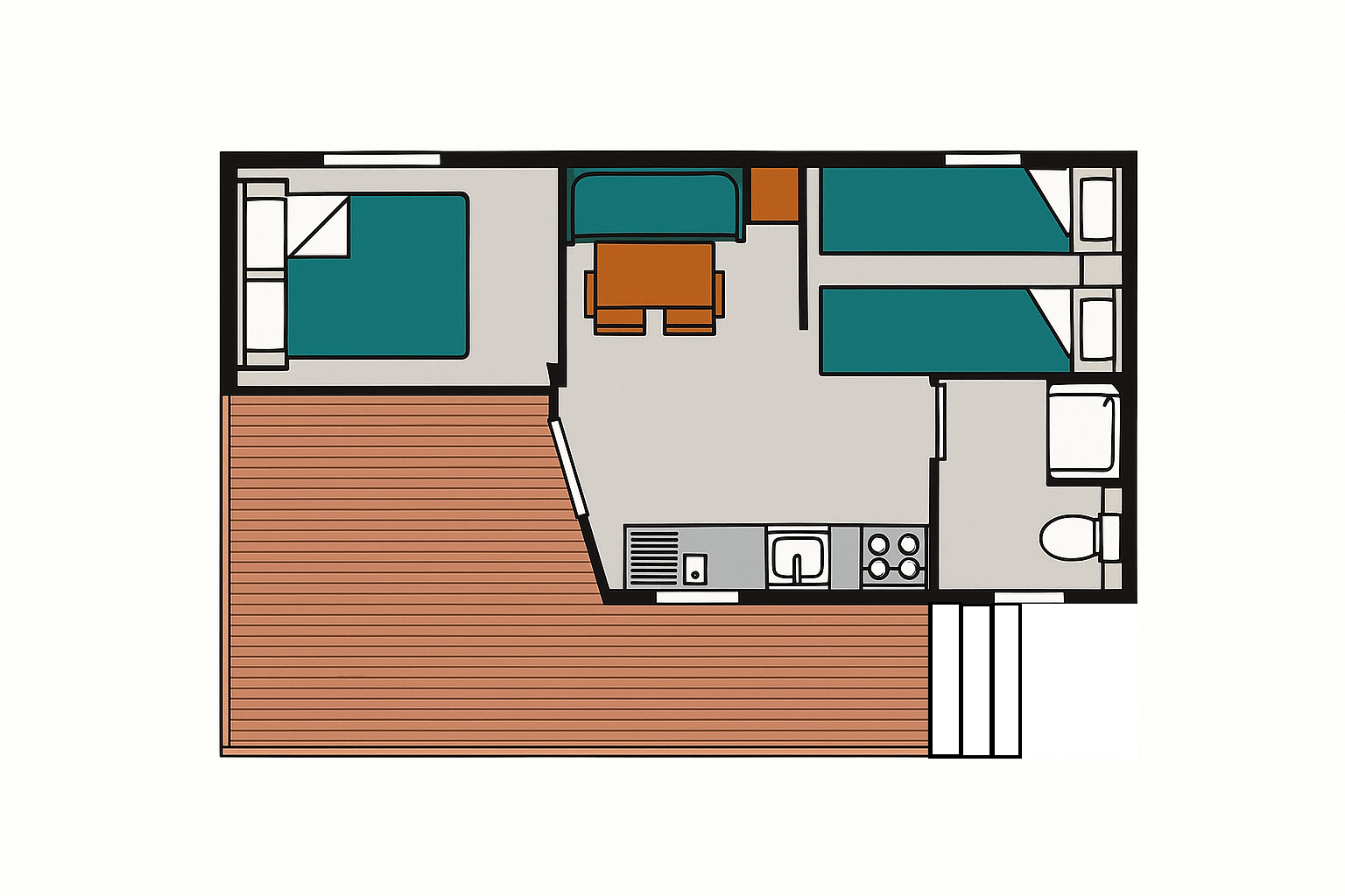 27m² + 20m² de terrasse partiellement couverte, une chambre avec lit double (160 x 200), une chambre avec 2 lits simples (80 x 190). Un coin repas convertible en lit 2 personnes (140 x 190). Une cuisine équipée. Une salle d’eau avec lavabo, douche et WC. Salon de jardin.