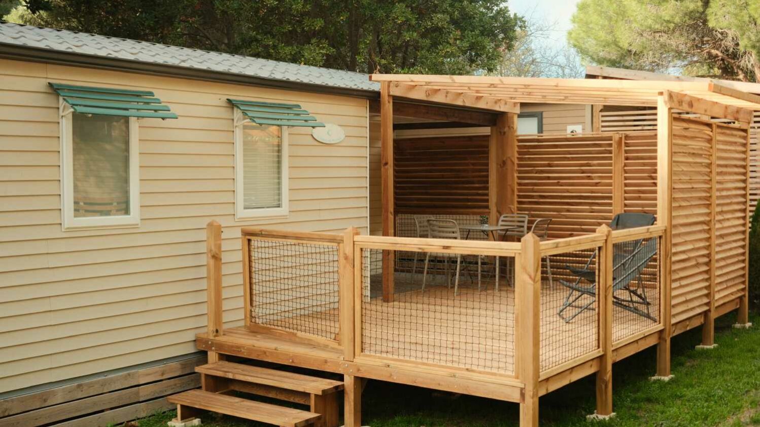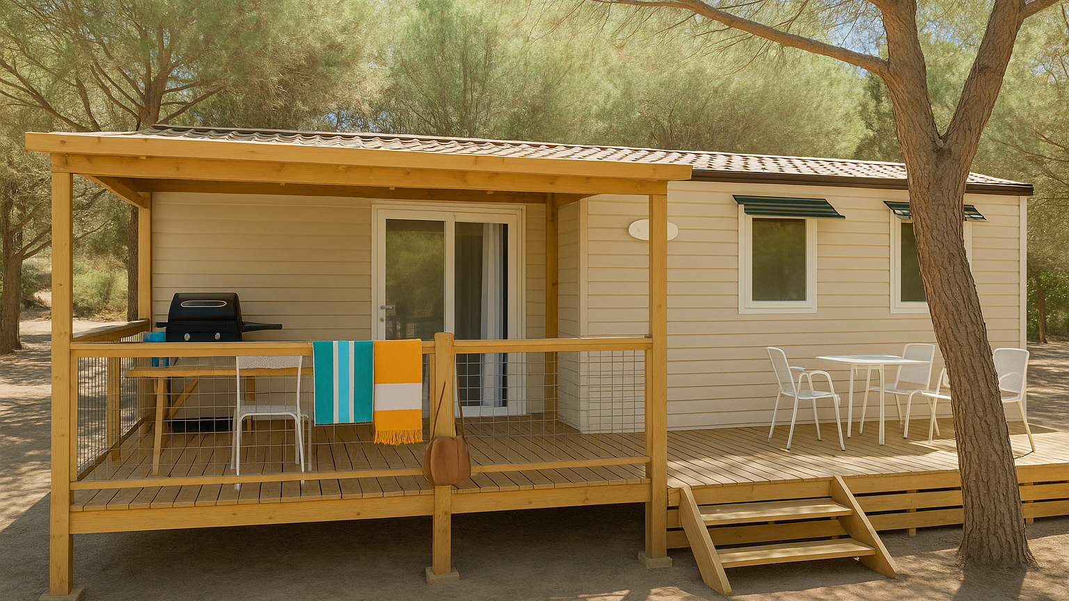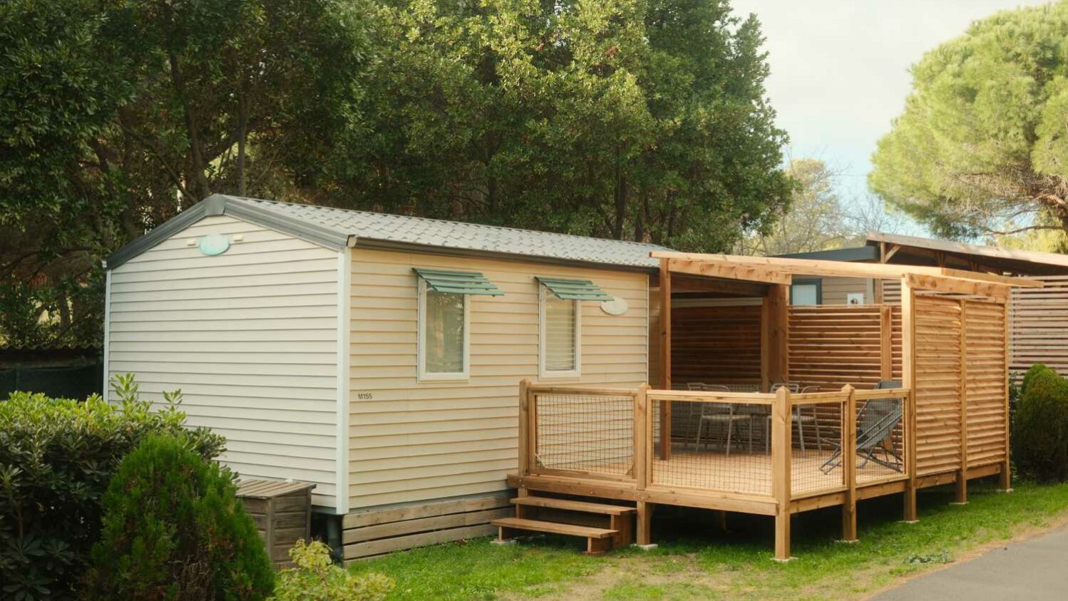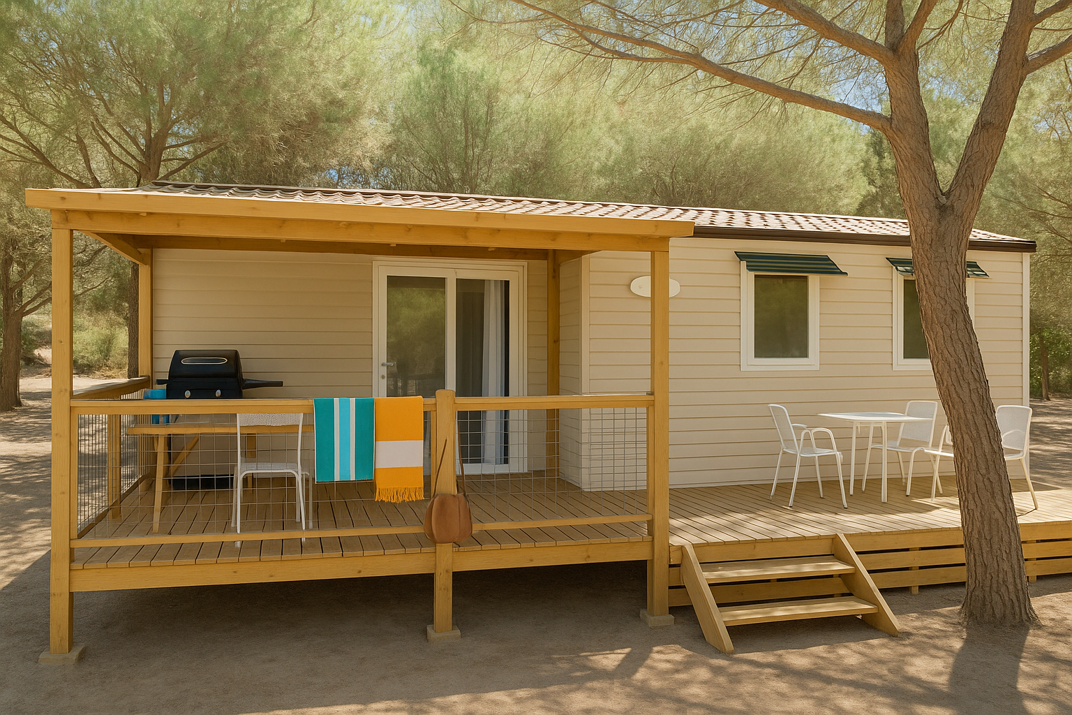 27m² + 20m² de terrasse partiellement couverte, une chambre avec lit double (160 x 200), une chambre avec 2 lits simples (80 x 190). Un coin repas convertible en lit 2 personnes (140 x 190). Une cuisine équipée. Une salle d’eau avec lavabo, douche et WC. Salon de jardin.