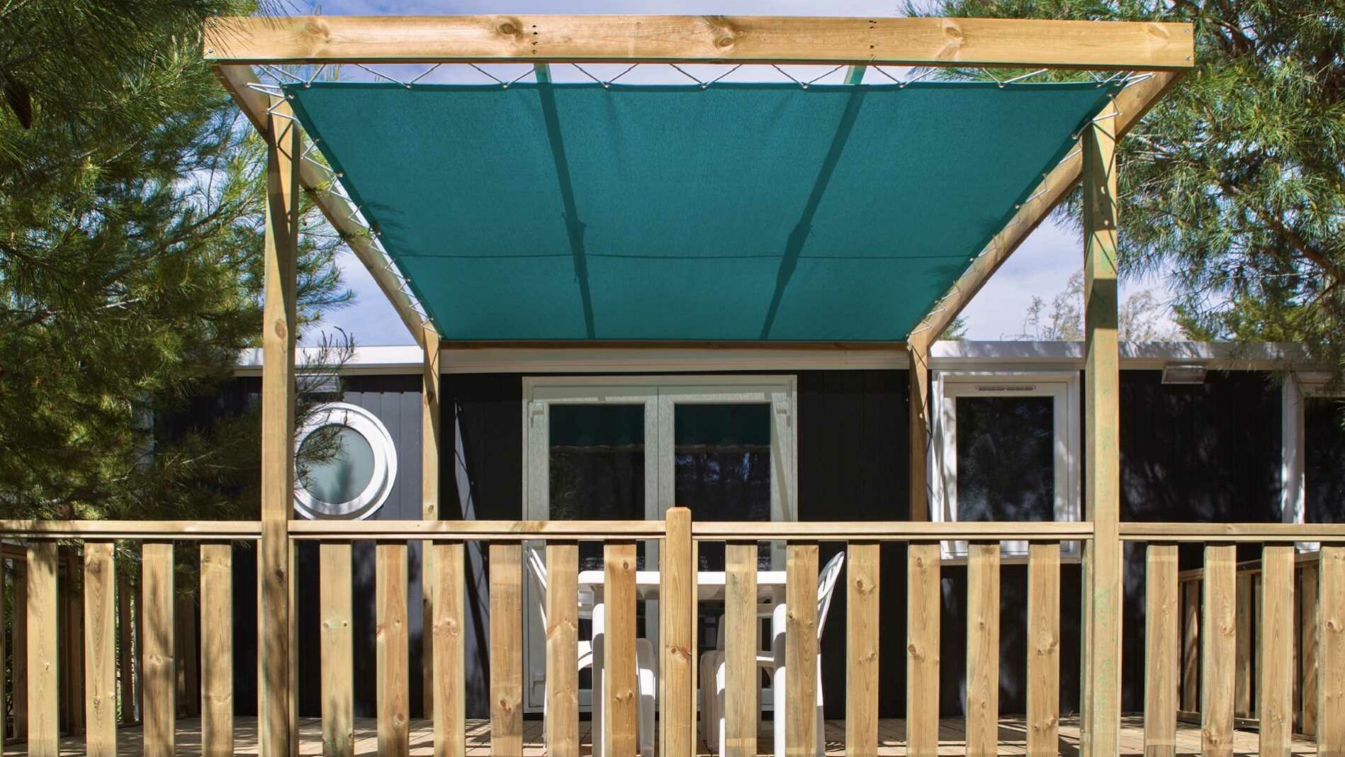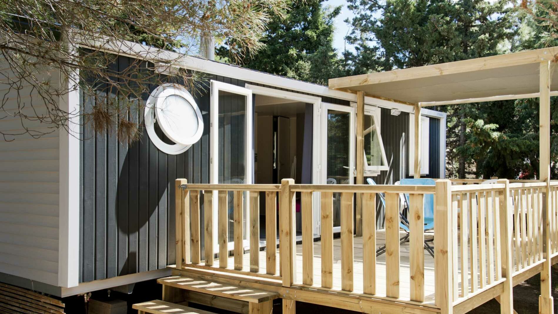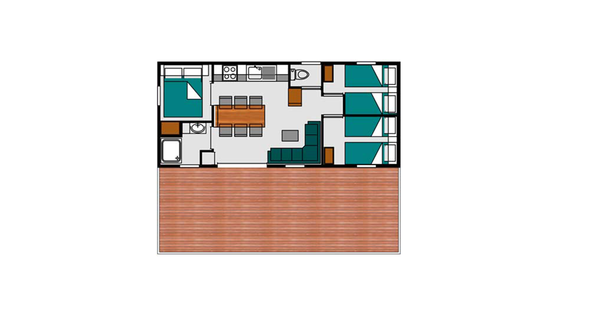 34 m² + 20 m² De terrasse couverte, une chambre double (160 x 200), deux chambres avec 2 lits simples (80 x 190), un coin salon, une grande cuisine entièrement équipée avec îlot central. Salle d’eau avec douche XXL (100 x 80), lavabo. WC séparé. Salon de jardin.