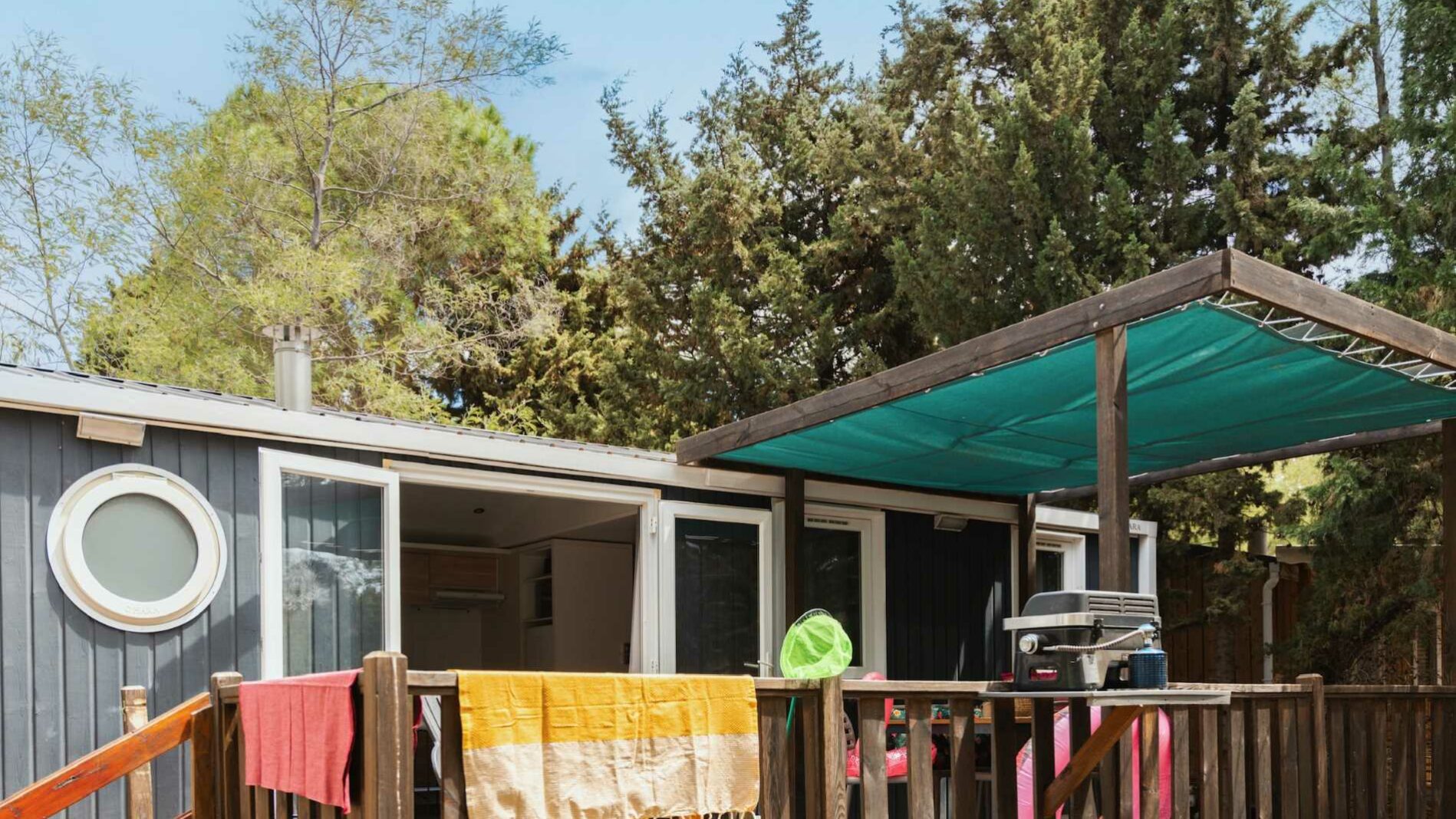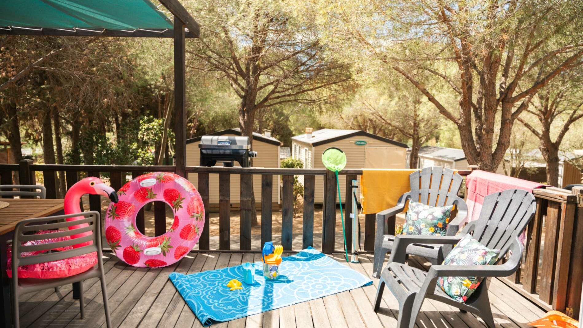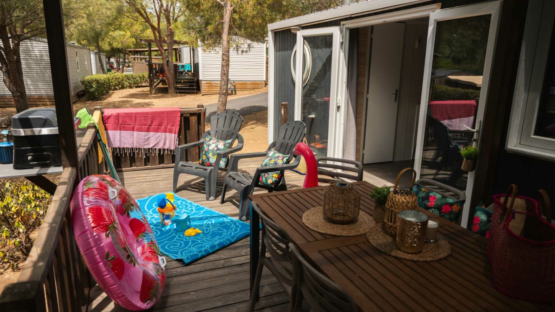 34 m² + 20 m² De terrasse couverte, une chambre double (160 x 200), deux chambres avec 2 lits simples (80 x 190), un coin salon, une grande cuisine entièrement équipée avec îlot central. Salle d’eau avec douche XXL (100 x 80), lavabo. WC séparé. Salon de jardin.