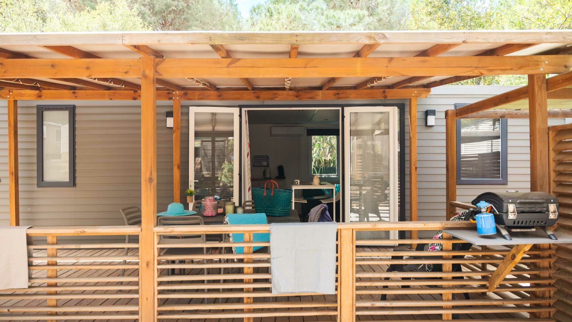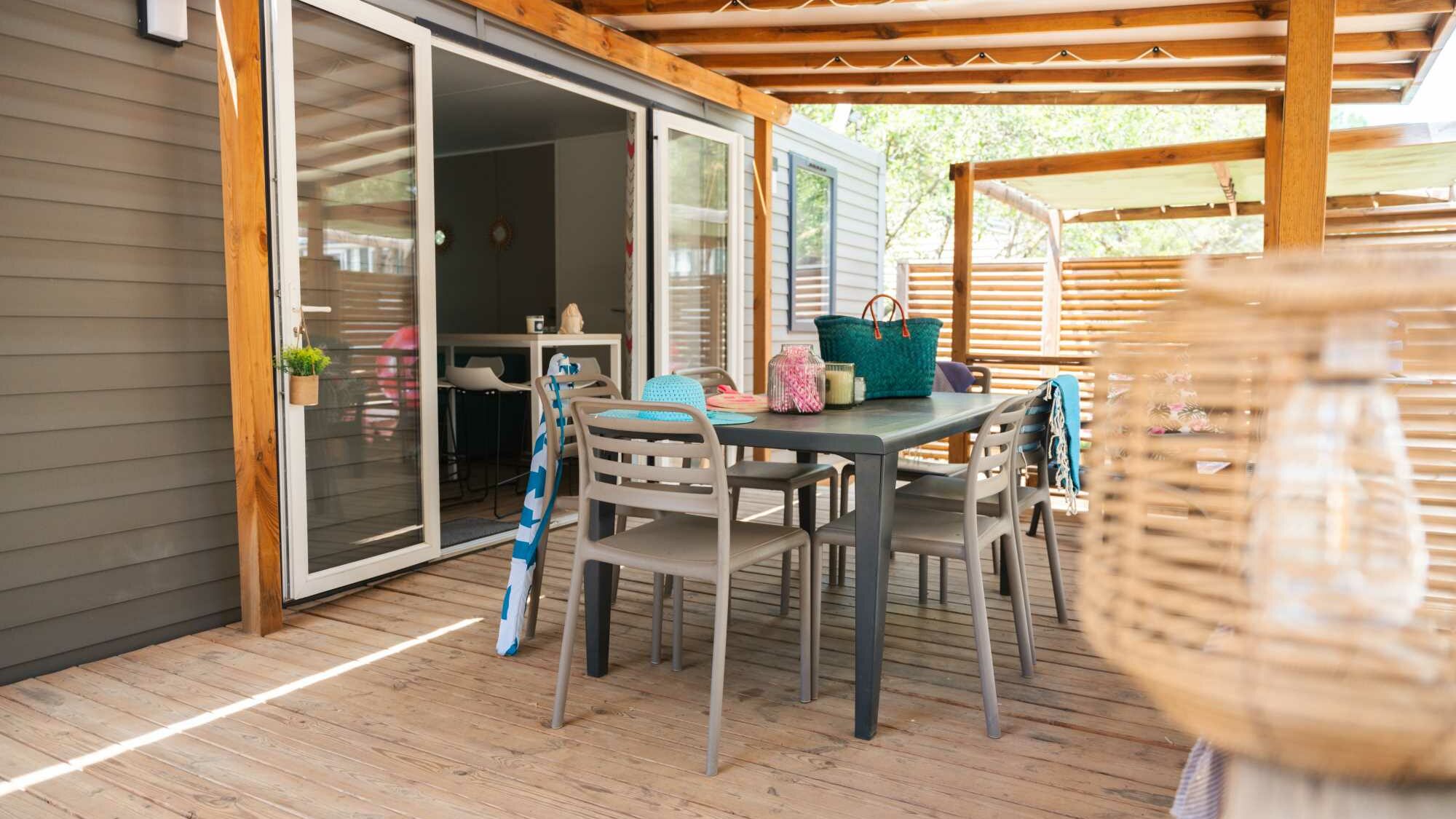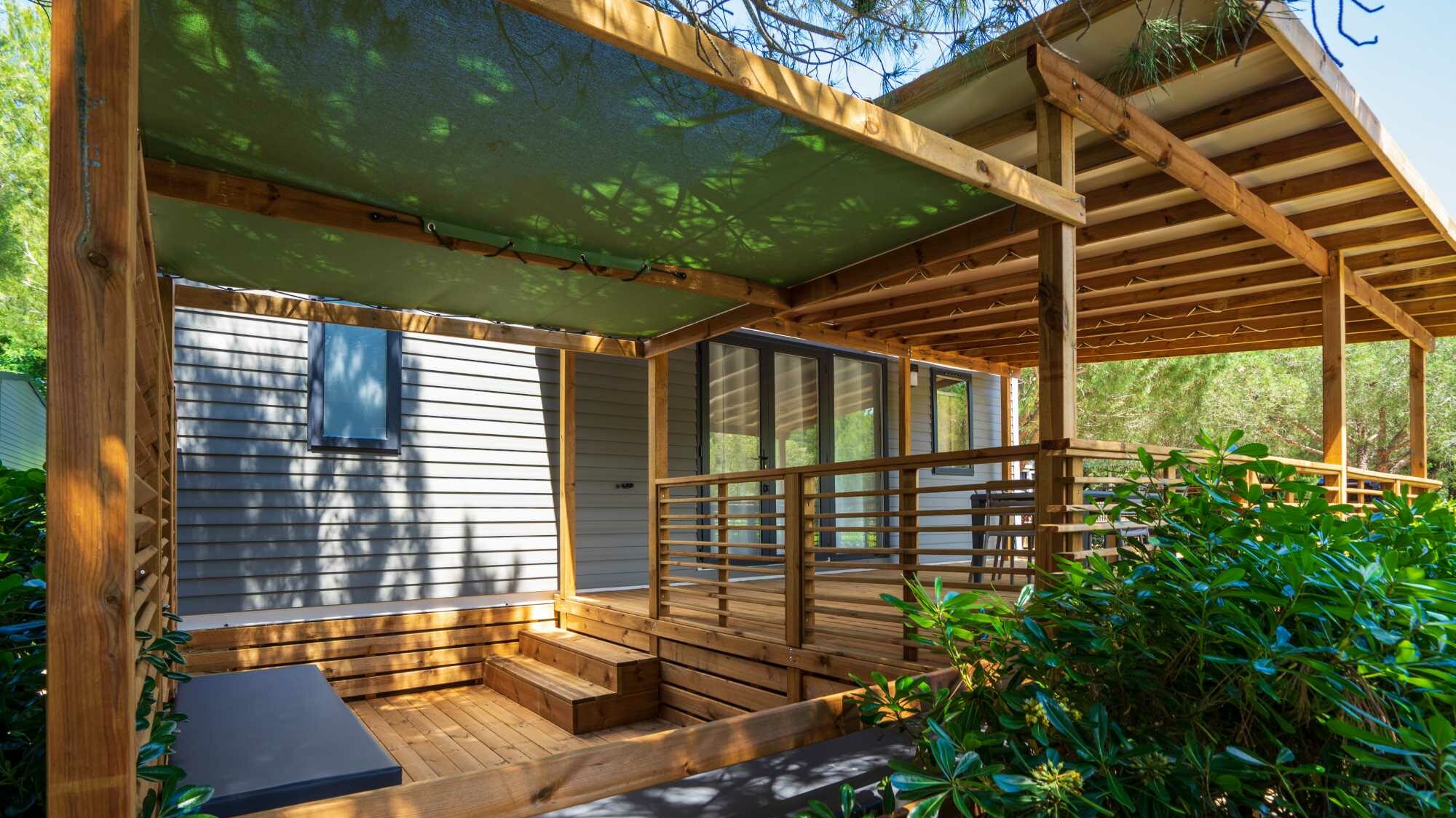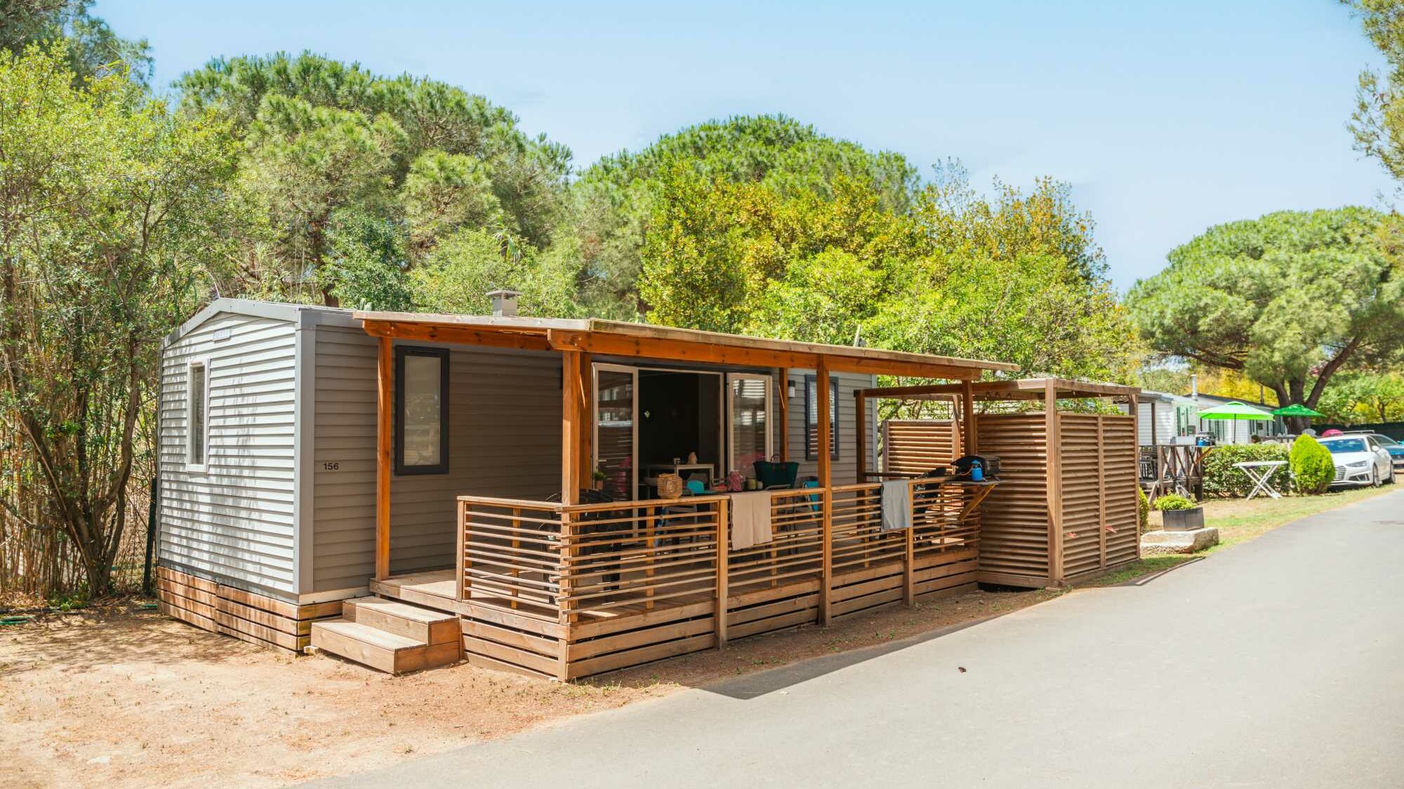 36 m², + 30m² de terrasse en bois sur deux niveaux de plancher, partiellement couverte. Une chambre double avec 1 lit (160 x 200), une chambre avec 2 lits simples (80 x 190), un coin salon convertible en 1 lit (140 x 190). Une grande cuisine américaine entièrement équipée. Une salle d’eau avec douche et lavabo. WC séparé. Salon de jardin et salon lounge extérieur.